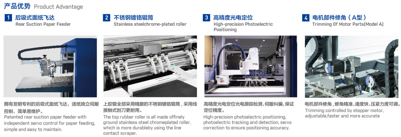 It can automatically feed and glue paper, delivery and position cardboard, and fold four sides in one process; there are features of accurate and quick positioning, and beautiful finished products etc. It is used to make hardcovers, notebook covers, desk calendars, hanging calendars, book-type boxes, fles and irregular covers etc.
