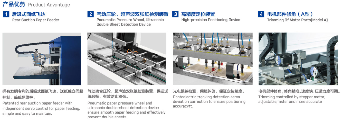 It can automatically feed and glue paper, delivery and position cardboard, and fold four sides in one process; there are features of accurate and quick positioning, and beautiful finished products etc. It is used to make hardcovers, notebook covers, desk calendars, hanging calendars, book-type boxes, fles and irregular covers etc.