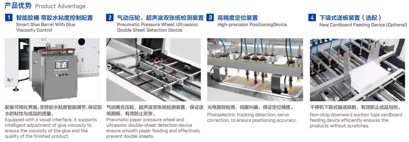 It can automatically feed and glue paper, delivery and position cardboard, and fold four sides in one process; there are features of accurate and quick positioning, and beautiful finished products etc. It is used to make hardcovers, notebook covers, desk calendars, hanging calendars, book-type boxes, fles and irregular covers etc.