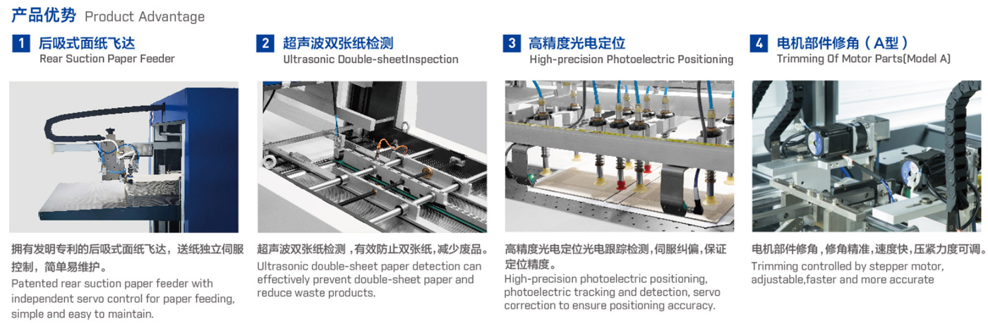It can automatically feed and glue paper, delivery and position cardboard, and fold four sides in one process; there are features of accurate and quick positioning, and beautiful finished products etc. It is used to make hardcovers, notebook covers, desk calendars, hanging calendars, book-type boxes, fles and irregular covers etc.