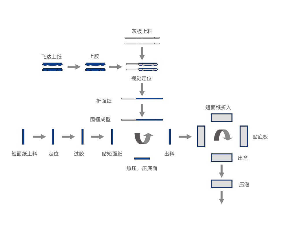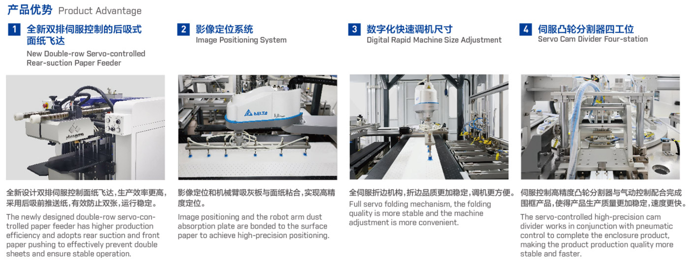 It can automatically feed and glue paper, delivery and position cardboard, and fold four sides in one process; there are features of accurate and quick positioning, and beautiful finished products etc. It is used to make hardcovers, notebook covers, desk calendars, hanging calendars, book-type boxes, fles and irregular covers etc.